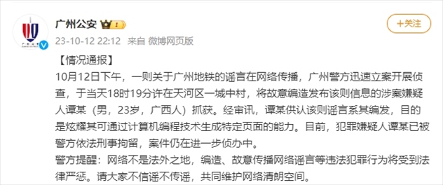 ·一男子造謠“廣州地鐵遭受恐怖襲擊”,已被警方刑事拘留。