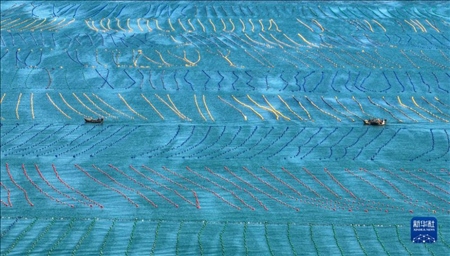 金秋時節(jié),在榮成市愛倫灣海洋牧場生態(tài)養(yǎng)殖區(qū),漁民駕駛漁船、舢板出海作業(yè)。