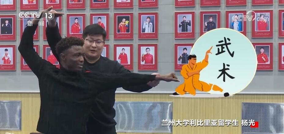 蘭州大學國際文化交流學院 利比里亞留學生 楊光:我已經(jīng)學中文一年半了,我喜歡中文,最喜歡武術(shù),我喜歡看很多中國的電影,特別是成龍的電影,因為他的動作很多。