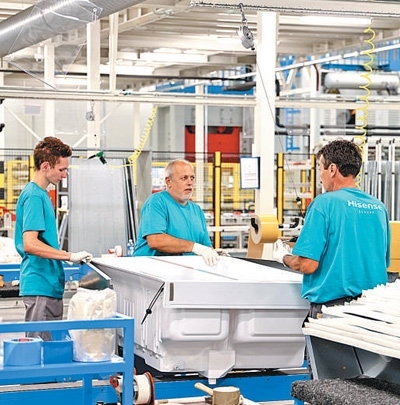 中國家電企業(yè)海信集團位于塞爾維亞瓦列沃的冰箱工廠今年9月正式投產(chǎn)運營。圖為工人在生產(chǎn)線上忙碌。本報記者 劉仲華攝