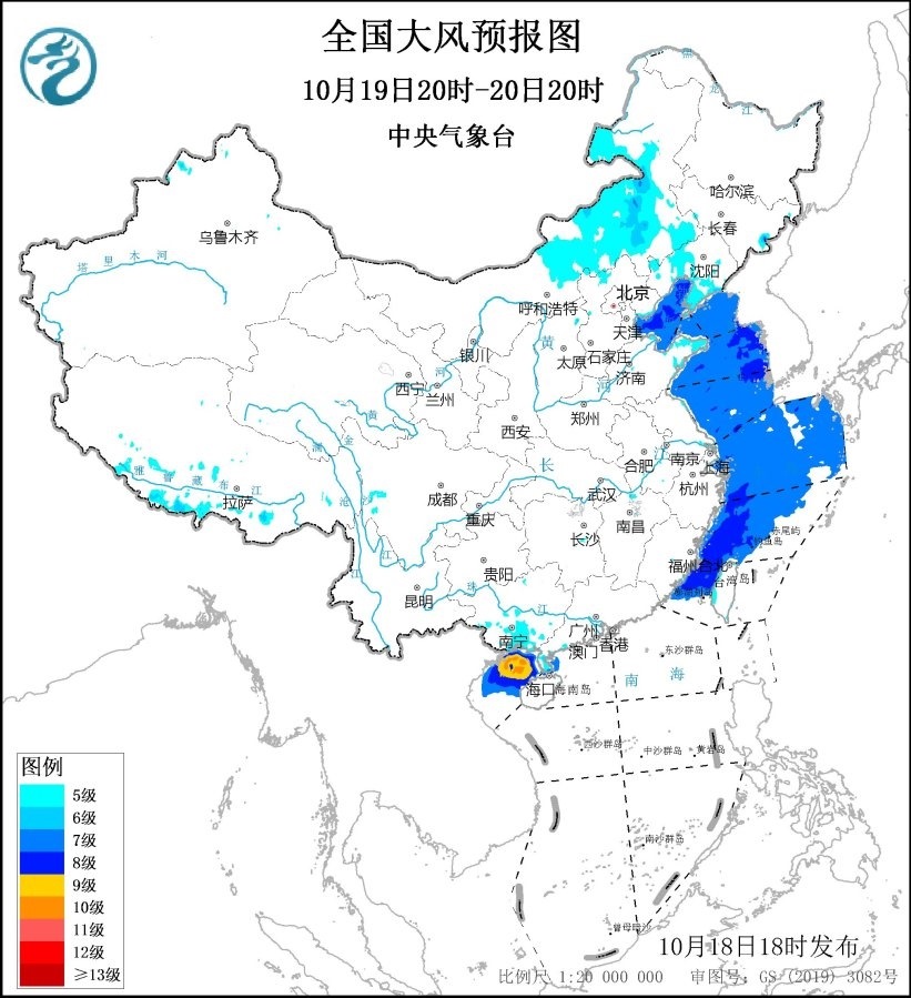 10月19日20時至20日20時,南海西北部海域、北部灣、瓊州海峽將有6~8級、陣風(fēng)9級的大風(fēng),其中北部灣的部分海域風(fēng)力可達(dá)9~10級,陣風(fēng)11~12級。渤海、渤海海峽、黃海大部海域、東海大部海域、臺灣海峽將有7~8級、陣風(fēng)9級的大風(fēng)。內(nèi)蒙古中東部、遼寧南部和西部、廣西南部沿海等地將有5~6級、陣風(fēng)7~8級的大風(fēng)。