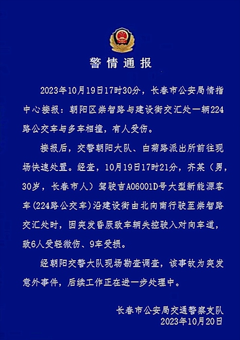 ·長春交警通報公交車與多車相撞:30歲司機(jī)突發(fā)昏厥致車輛失控,6人輕微傷。