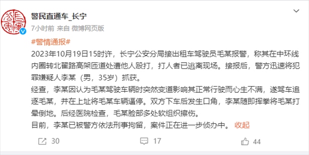 ·男子別停出租車打暈司機(jī),警方:對出租車突然變道心懷不滿,已刑拘。