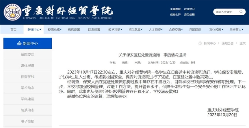 ·重慶對外經(jīng)貿(mào)學(xué)院通報“流浪狗被保安驅(qū)趕處置致死”:涉事保安停職。
