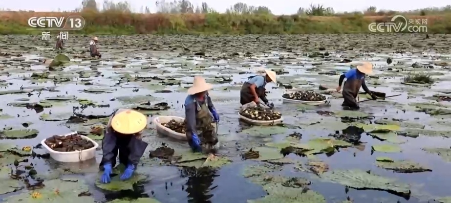 在安徽霍邱縣宋店鎮(zhèn)小路芡實(shí)種植家庭農(nóng)場(chǎng),十幾名工人正在水中采摘芡實(shí)。