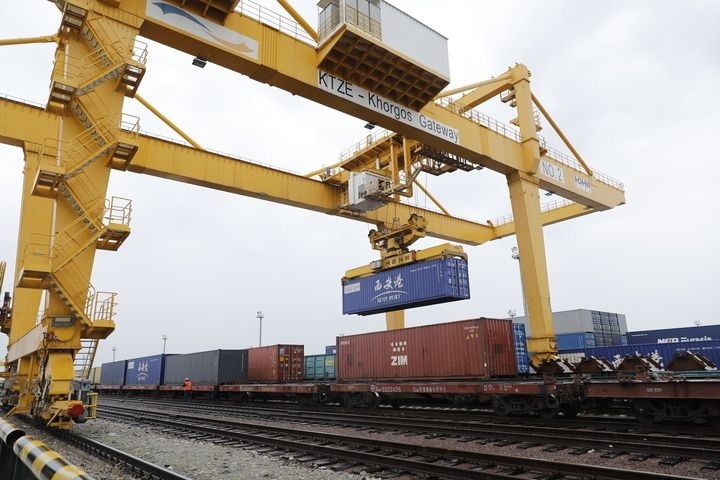 2022年5月19日,在哈薩克斯坦南部中哈邊境地區(qū)的“霍爾果斯-東大門(mén)”無(wú)水港內(nèi),龍門(mén)吊正在工作。新華社發(fā)(奧斯帕諾夫攝)