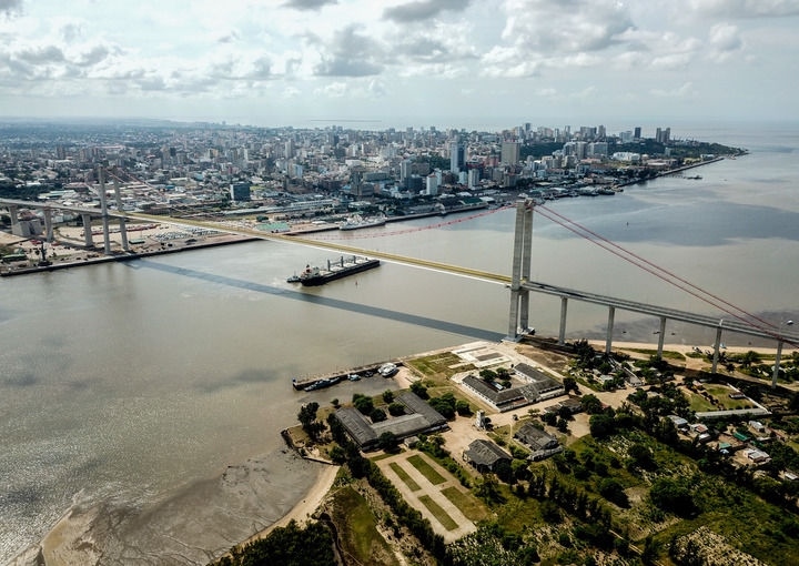 這是2019年4月8日在莫桑比克首都馬普托拍攝的馬普托大橋(無(wú)人機(jī)照片)。新華社記者 張宇 攝
