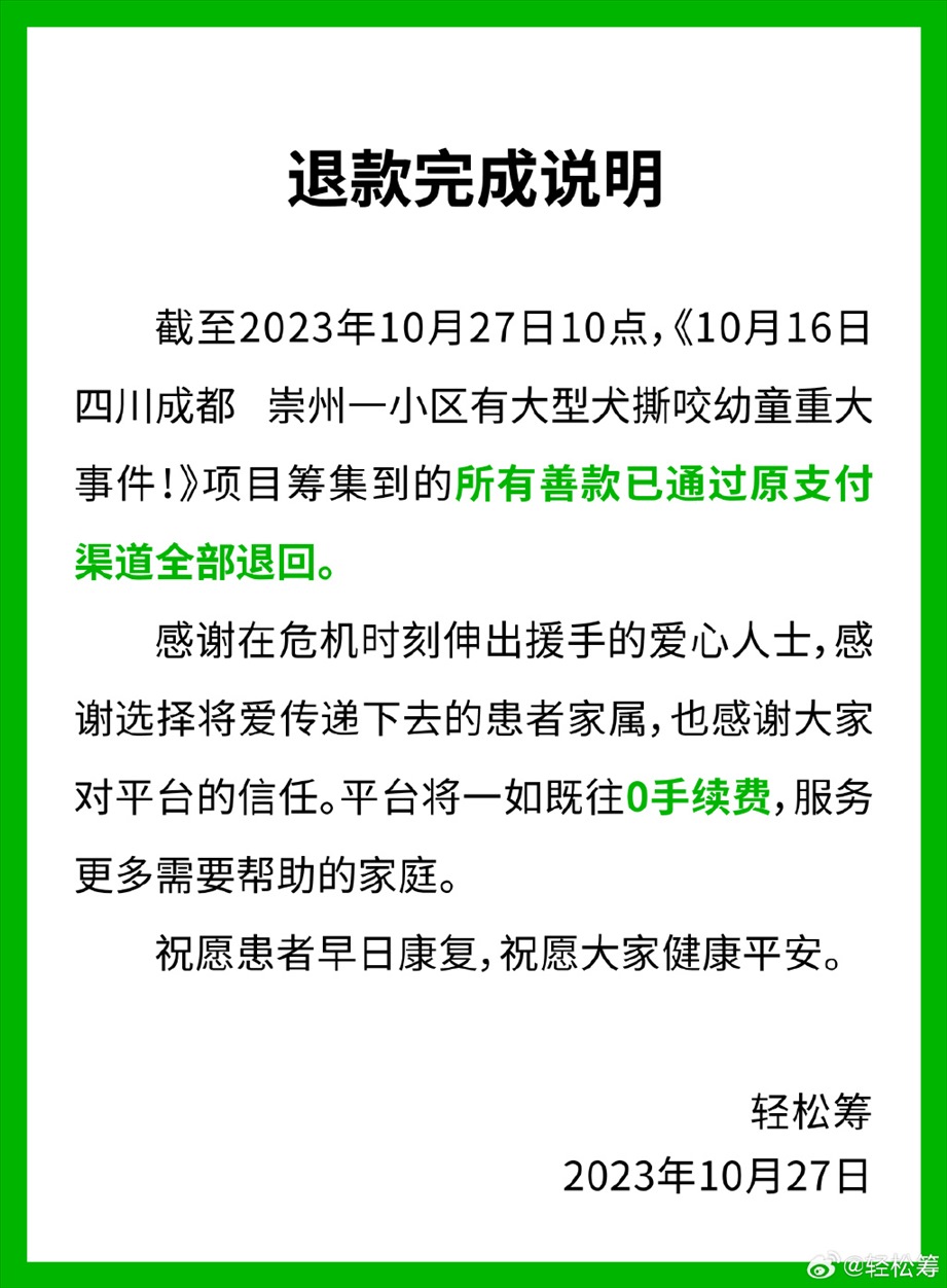·輕松籌平臺(tái)稱為被狗咬女童籌集的所有善款已全部退回。