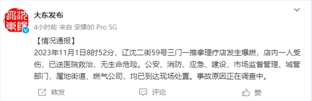 ·遼寧省沈陽市大東區(qū)遼沈二街59號三門一推拿理療店發(fā)生爆燃,店內一人受傷。