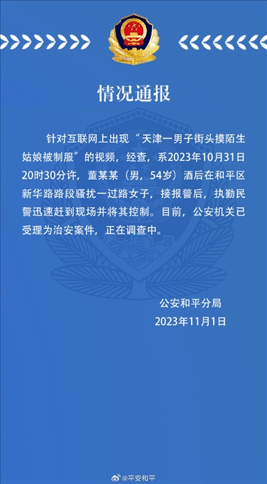 ·天津一男子街頭騷擾過路女子被警方控制,警方:已受理為治安案件。