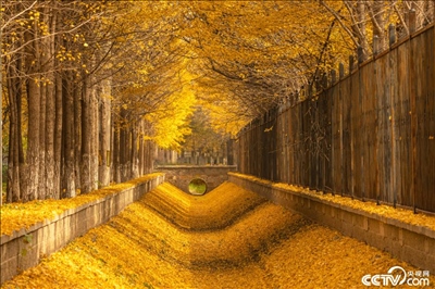 北京海淀區(qū)溫泉鎮(zhèn)街角公園,銀杏樹(shù)葉飄落,滿(mǎn)地金黃。