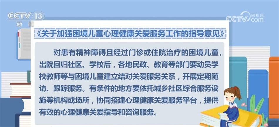央視網(wǎng)消息:近日,民政部等五部門聯(lián)合印發(fā)《關(guān)于加強(qiáng)困境兒童心理健康關(guān)愛服務(wù)工作的指導(dǎo)意見》,通過加強(qiáng)心理健康教育、開展心理健康監(jiān)測等措施,全面提升困境兒童心理健康水平和身心健康素質(zhì)。