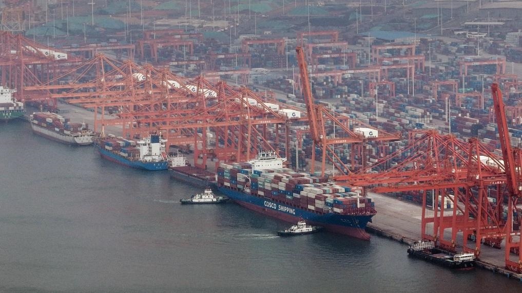 10月26日,在欽州港集裝箱裝卸碼頭,海事船正在協(xié)助海輪離岸(無人機照片)。新華社記者 張愛林 攝