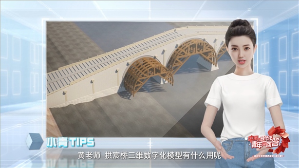 作為黃碩的好幫手,AI數字人小青給大家介紹說,三維動畫中,展現了拱宸橋從選址、圍堰到打樁、搭建、填碎石的全過程,拱宸橋三維數字化項目成為大運河保護傳承利用的案例之一。