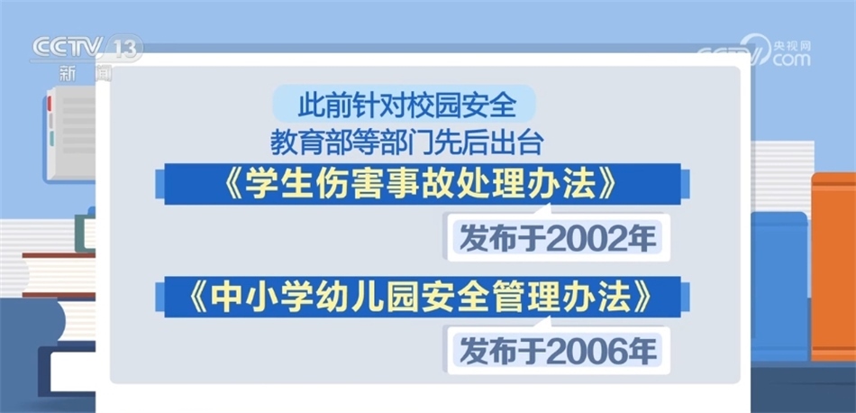 據(jù)介紹,此前針對校園安全,教育部等部門先后出臺了《學(xué)生傷害事故處理辦法》《中小學(xué)幼兒園安全管理辦法》。前者發(fā)布于2002年,后者發(fā)布于2006年,專家認為,這兩條《辦法》作為規(guī)范性文件,制定時間久遠,一些規(guī)定較為籠統(tǒng),亟待更新和修訂。