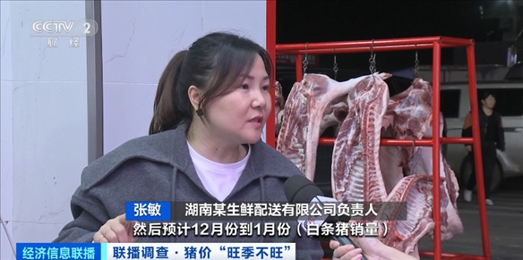 湖南某生鮮配送有限公司負(fù)責(zé)人 張敏:10月份到11月份(每天銷量)是450頭到600頭。預(yù)計(jì)12月份到1月份(白條豬銷量)會(huì)增長(zhǎng)到一天800頭到1000頭。
