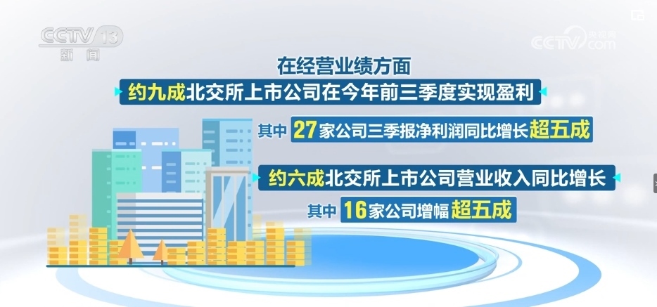 在經(jīng)營業(yè)績方面,約九成北交所上市公司在2023年前三季度實(shí)現(xiàn)盈利。其中,27家公司三季報凈利潤同比增長超五成。約六成北交所上市公司營業(yè)收入同比增長,其中,16家公司增幅超五成。