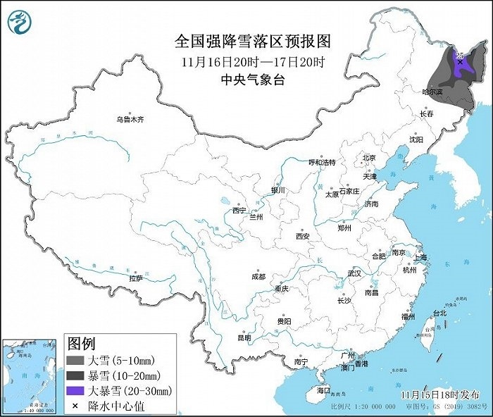 其中,11月15日20時至16日20時,黑龍江中部、吉林東部等地部分地區(qū)有大雪,黑龍江中部局地有暴雪(10~12毫米),上述部分地區(qū)新增積雪深度3~5厘米,局地可達(dá)7厘米以上。16日20時至17日20時,黑龍江中東部、吉林東北部等地部分地區(qū)有大雪,黑龍江東部部分地區(qū)有暴雪,局地大暴雪(20~25毫米),上述部分地區(qū)新增積雪深度5~10厘米,局地可達(dá)15厘米。