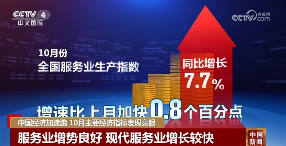 再來看服務(wù)業(yè)。服務(wù)業(yè)增勢良好,現(xiàn)代服務(wù)業(yè)增長較快。10月份,服務(wù)業(yè)生產(chǎn)指數(shù)同比增長7.7%,比上月加快0.8個(gè)百分點(diǎn)。其中,住宿和餐飲業(yè)、批發(fā)和零售業(yè)、交通運(yùn)輸倉儲和郵政業(yè)等聚集型服務(wù)業(yè)都保持兩位數(shù)增長。