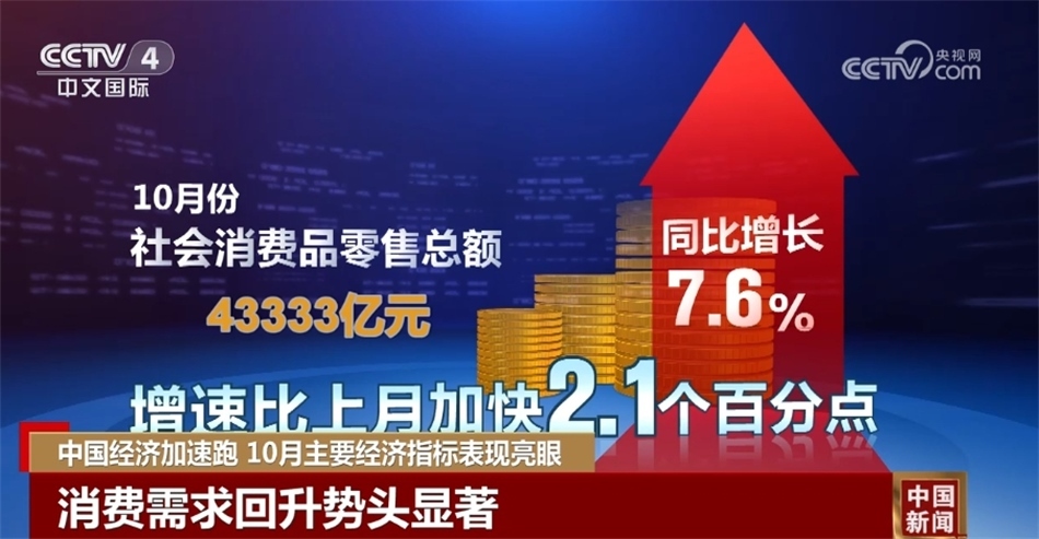 此外,消費(fèi)需求回升勢頭顯著。10月份,社會消費(fèi)品零售總額43333億元,同比增長7.6%,增速比上月加快2.1個(gè)百分點(diǎn)。與此同時(shí),升級類消費(fèi)也穩(wěn)步恢復(fù)。10月份,汽車類、金銀珠寶類、體育娛樂用品類商品零售額同比增速均比上月加快。