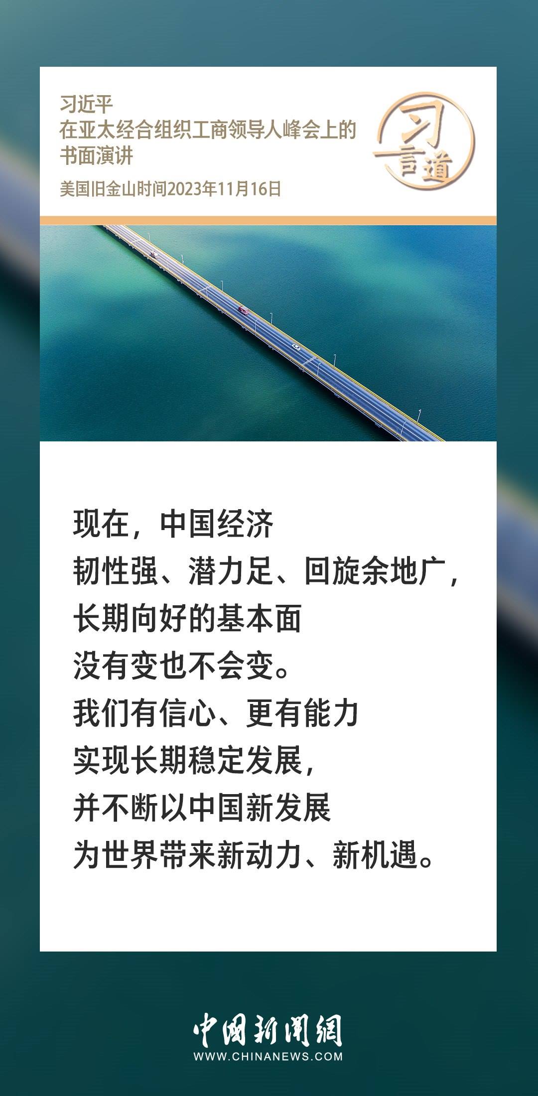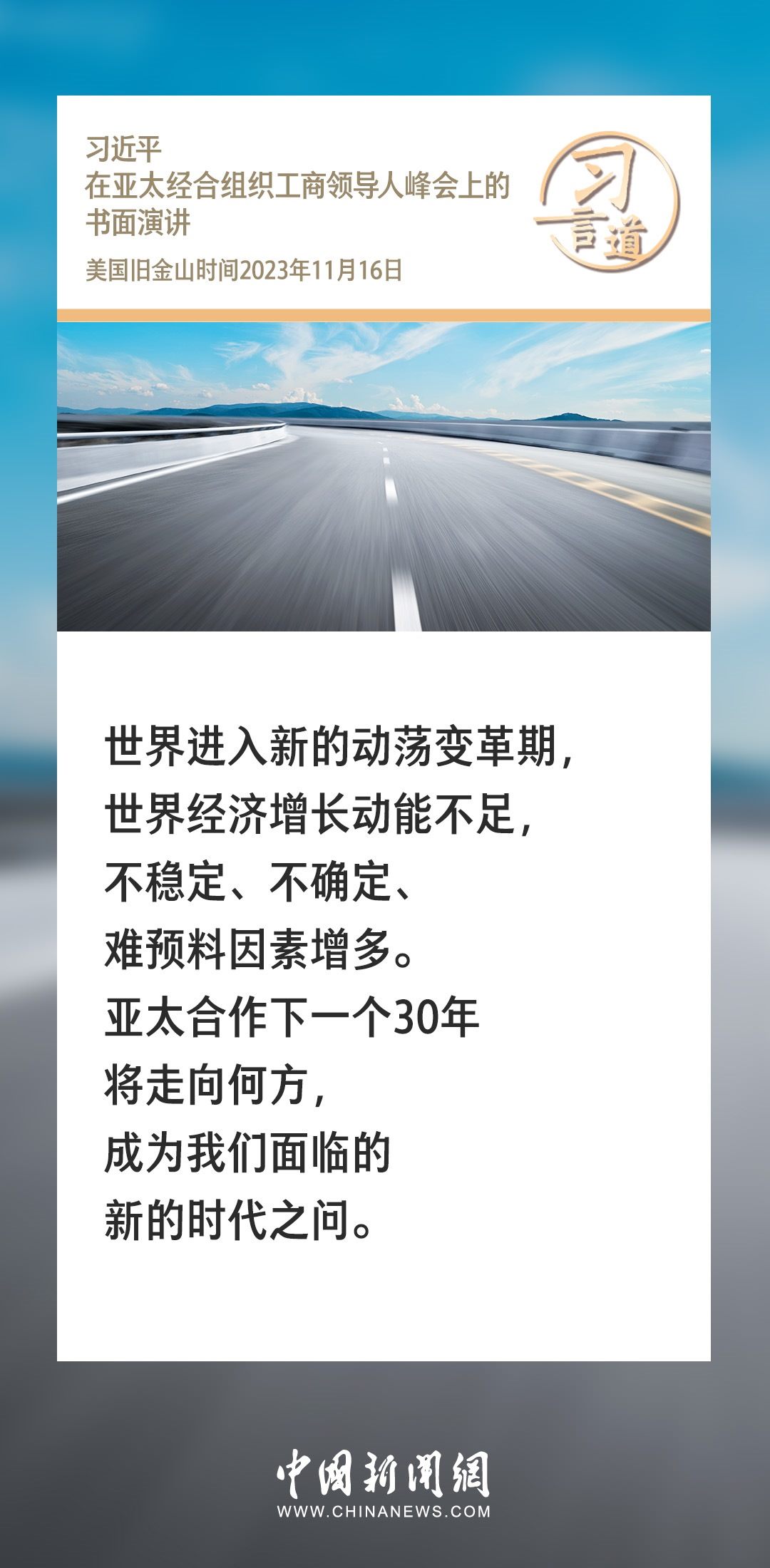 當(dāng)?shù)貢r(shí)間11月16日上午,國家主席習(xí)近平向在舊金山舉行的亞太經(jīng)合組織工商領(lǐng)導(dǎo)人峰會(huì)發(fā)表題為《同心協(xié)力 共迎挑戰(zhàn) 譜寫亞太合作新篇章》的書面演講。習(xí)近平指出——