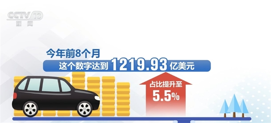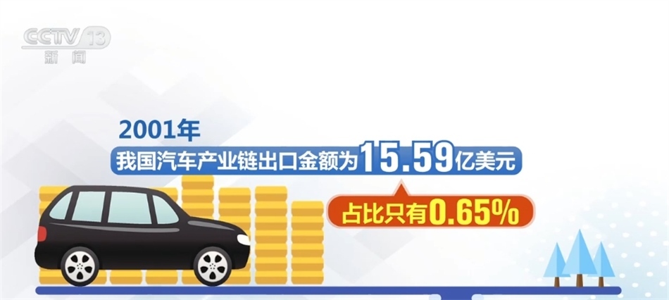 中國貿(mào)促會汽車分會負責人表示,2001年,我國汽車產(chǎn)業(yè)鏈出口金額為15.59億美元,占比只有0.65%。今年前8個月,這個數(shù)字達到1219.93億美元,占比提升至5.5%。
