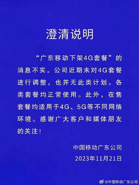 ·中國(guó)移動(dòng)廣東公司:“下架4G套餐”消息不實(shí),也無此類計(jì)劃。