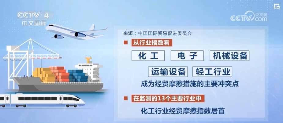 而從行業(yè)指數(shù)看,化工、電子、機(jī)械設(shè)備、運(yùn)輸設(shè)備和輕工行業(yè)成為經(jīng)貿(mào)摩擦措施的主要沖突點(diǎn)。在監(jiān)測(cè)的13個(gè)主要行業(yè)中,化工行業(yè)經(jīng)貿(mào)摩擦指數(shù)居首。