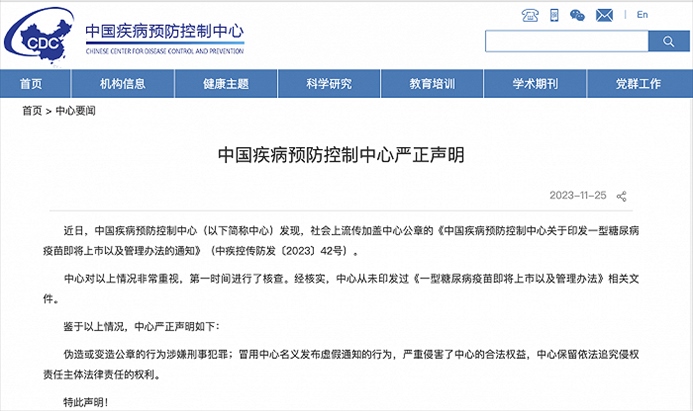 ·中疾控辟謠:從未印發(fā)過(guò)《一型糖尿病疫苗即將上市以及管理辦法》相關(guān)文件。