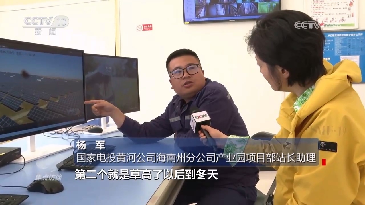 國家電投黃河公司海南州分公司產(chǎn)業(yè)園項(xiàng)目部站長助理?xiàng)钴姡骸肮夥逑旅孢@些羊,就是我們請過來幫忙除草的。因?yàn)槊磕暌坏较奶?,園區(qū)電池組件下面草就特別高,長高了以后會遮擋電池組件,一個(gè)是影響發(fā)電效率,再一個(gè)秋冬季有火災(zāi)隱患?!?/p>