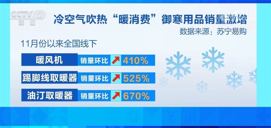 ?????? 數據顯示,11月份以來,某家電賣場全國線下暖風機銷量環(huán)比增長410%,踢腳線取暖器銷量環(huán)比增長525%,油汀取暖器銷量環(huán)比增長670%。此外,某電商平臺上,暖鞋器、發(fā)熱圍脖、水暖毯、電暖桌等新型取暖設備的銷售額環(huán)比增長超過一倍。