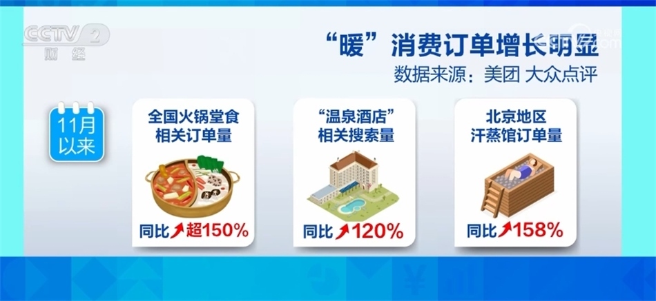 ?????? 數據顯示,11月份以來,全國火鍋堂食相關訂單量同比增長超150%,“溫泉酒店”的相關搜索量同比增長120%,其中北京地區(qū)汗蒸館訂單量同比增長158%。