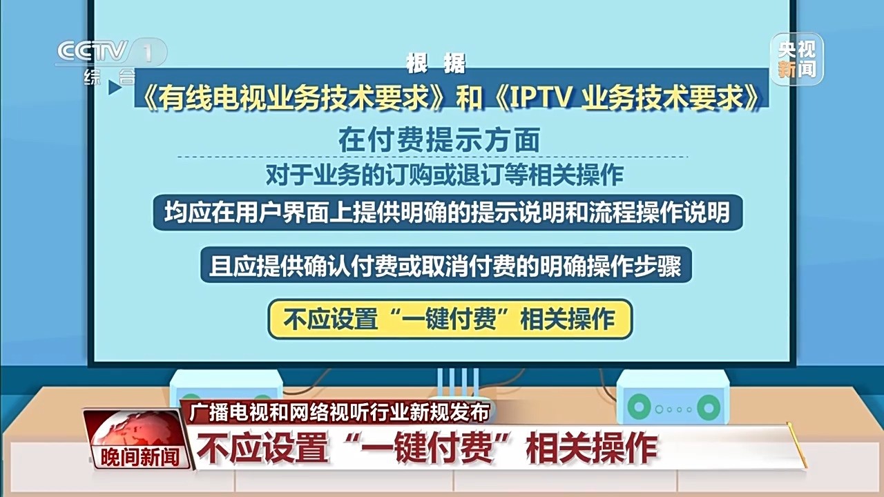 在付費(fèi)提示方面,對(duì)于業(yè)務(wù)的訂購或退訂等相關(guān)操作,均應(yīng)在用戶界面上,提供明確的提示說明和流程操作說明,且應(yīng)提供確認(rèn)付費(fèi)或取消付費(fèi)的明確操作步驟,不應(yīng)設(shè)置“一鍵付費(fèi)”相關(guān)操作。此外,有線電視和IPTV遙控器應(yīng)具備快捷看直播頻道的按鍵,通過此按鍵直接進(jìn)入全屏直播,按鍵名稱應(yīng)為“看電視”。