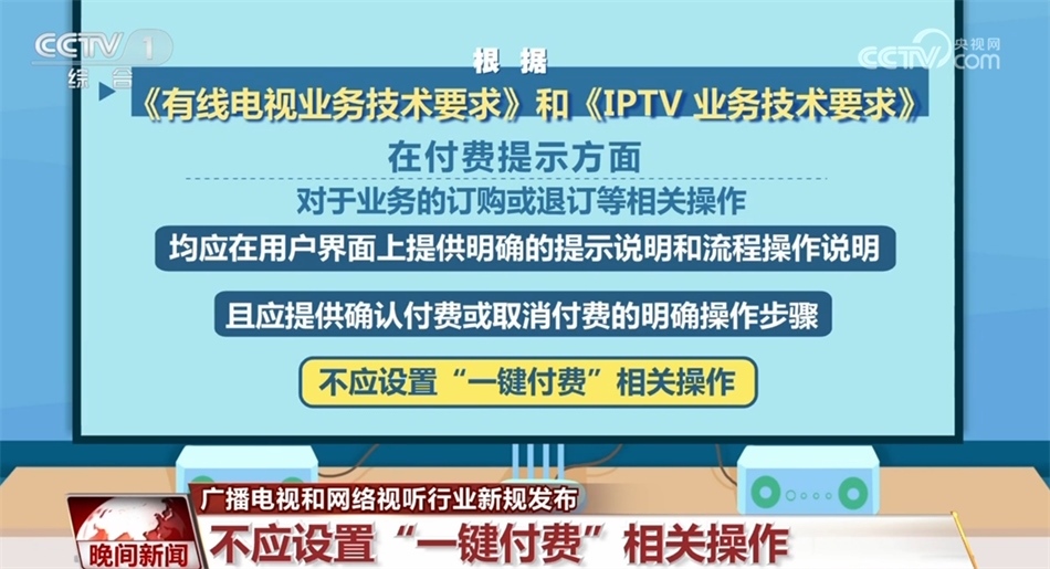在付費(fèi)提示方面,對(duì)于業(yè)務(wù)的訂購或退訂等相關(guān)操作,均應(yīng)在用戶界面上提供明確的提示說明和流程操作說明,且應(yīng)提供確認(rèn)付費(fèi)或取消付費(fèi)的明確操作步驟,不應(yīng)設(shè)置“一鍵付費(fèi)”相關(guān)操作。此外,有線電視和IPTV遙控器應(yīng)具備快捷看直播頻道的按鍵,通過此按鍵直接進(jìn)入全屏直播,按鍵名稱應(yīng)為“看電視”。