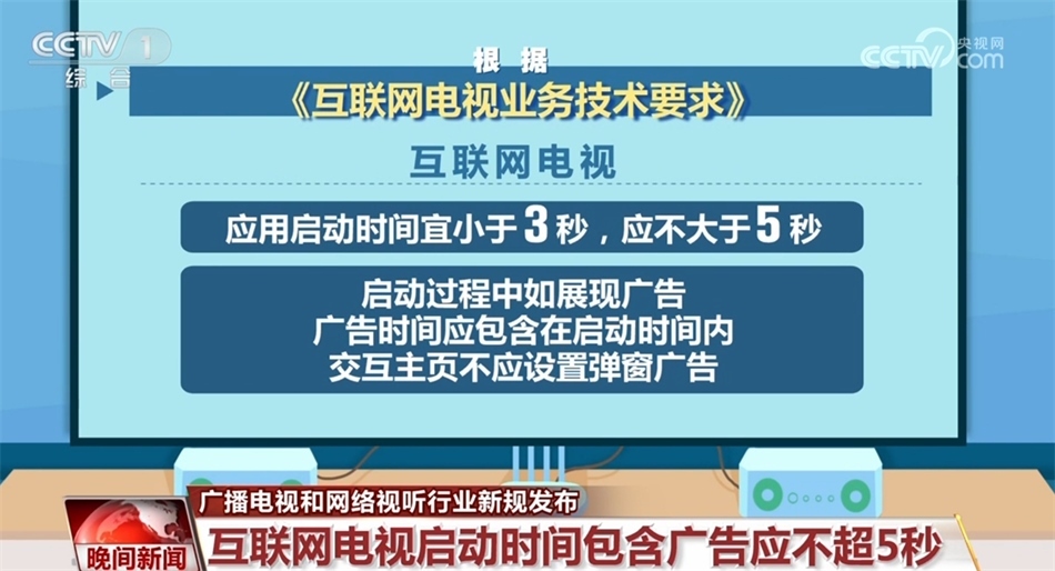 根據(jù)《互聯(lián)網(wǎng)電視業(yè)務(wù)技術(shù)要求》,互聯(lián)網(wǎng)電視應(yīng)用啟動(dòng)時(shí)間宜小于3秒,應(yīng)不大于5秒,啟動(dòng)過程中如展現(xiàn)廣告,廣告時(shí)間應(yīng)包含在啟動(dòng)時(shí)間內(nèi)。交互主頁不應(yīng)設(shè)置彈窗廣告。交互主頁應(yīng)設(shè)置顯著、便捷的免費(fèi)業(yè)務(wù)專區(qū)入口。在付費(fèi)提示方面,互聯(lián)網(wǎng)電視對(duì)于業(yè)務(wù)的訂購或退訂等相關(guān)操作不應(yīng)設(shè)置“一鍵付費(fèi)”,對(duì)于任何業(yè)務(wù)的定期或連續(xù)扣費(fèi),均應(yīng)在扣費(fèi)前明確、主動(dòng)提示用戶。