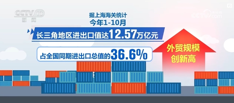 據(jù)上海海關統(tǒng)計,2023年1—10月,長三角地區(qū)進出口值達12.57萬億元,占全國同期進出口總值的36.6%,外貿(mào)規(guī)模創(chuàng)新高。
