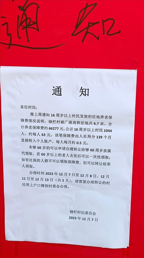 ·廣東一村發(fā)征地養(yǎng)老保障費(fèi)每人每月0.5元?村委會(huì)回應(yīng)稱(chēng)錢(qián)少人多。