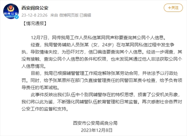 ·西安閻良公安通報(bào)警務(wù)輔助人員稱(chēng)要查網(wǎng)友個(gè)人信息:解除勞動(dòng)合同,予以行政處罰。
