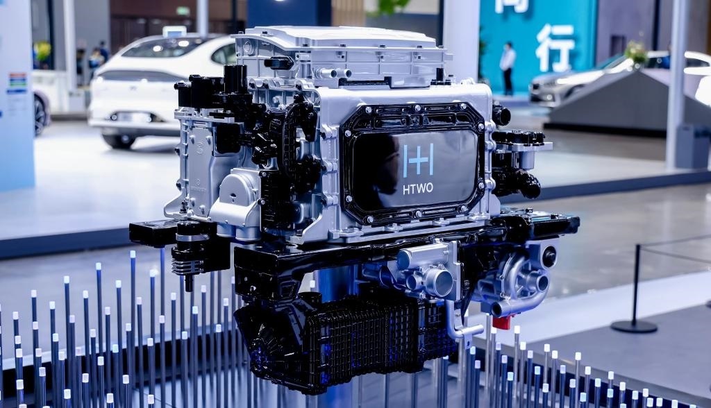 ?在2023世界新能源汽車大會技術(shù)展區(qū),車企展示的一款氫燃料電池系統(tǒng)。新華社記者夏天 攝