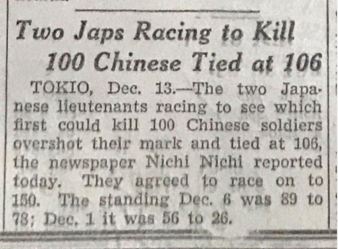 “根據(jù)《東京日日新聞》報(bào)道,兩名日本軍官比賽看誰(shuí)能先殺死100名中國(guó)士兵,結(jié)果都?xì)⒘顺^100人,雙方打平殺了106人,他們又同意重新比賽殺到150人為止,12月6日是89比78,12月1日是56比26?!边@是1937年12月14日發(fā)行的《芝加哥每日論壇》中,一篇有關(guān)兩名日本軍官進(jìn)行“百人斬”殺人競(jìng)賽的報(bào)道節(jié)選。