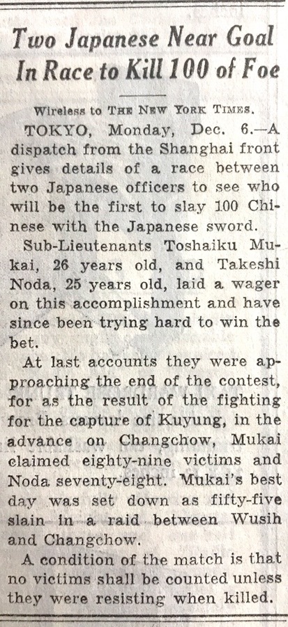 在1937年12月6日發(fā)行的《紐約時(shí)報(bào)》中,也登載了有關(guān)日軍“百人斬”殺人競(jìng)賽的報(bào)道。報(bào)道稱,來自上海前線的一份電報(bào)詳細(xì)介紹了兩名日本軍官之間的一場(chǎng)比賽,看誰(shuí)先殺死100名中國(guó)人。年紀(jì)分別為25歲和26歲的日本軍官把賭注壓在了這項(xiàng)“成就”上。