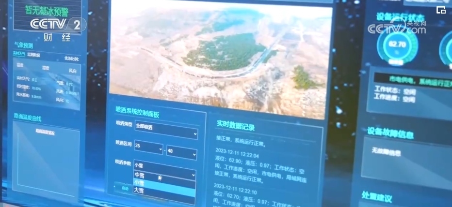 12月11日上午,記者看到肥城市交通部門(mén)工作人員,在監(jiān)控中心,遠(yuǎn)程啟動(dòng)了路面融冰融雪系統(tǒng)。在儀汶公路棋石嶺“S”形路段出,路邊噴頭噴灑環(huán)保型融雪劑快速融化路面的冰雪。