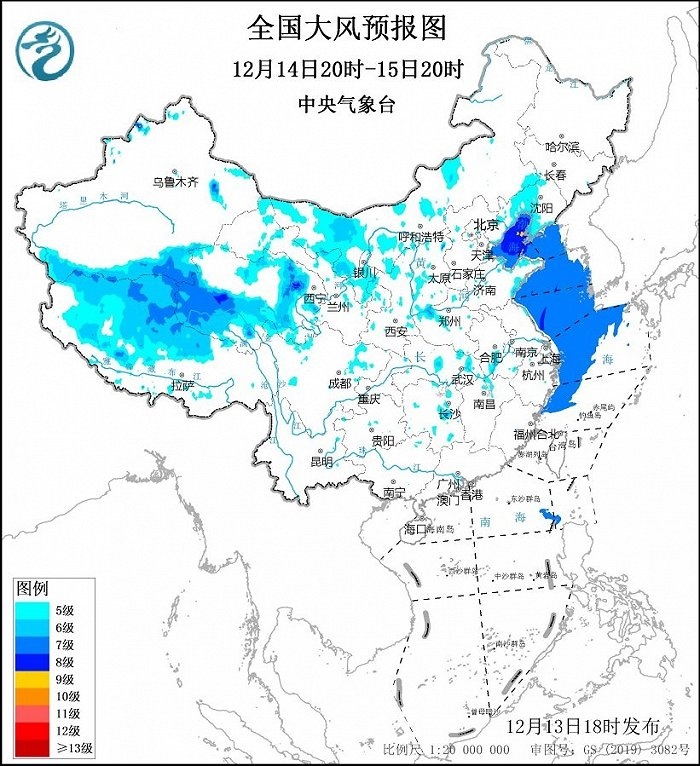 12月14日20時至15日20時,內(nèi)蒙古中西部、寧夏、西藏西部、青海東部和南部等地部分地區(qū)有5~6級、陣風(fēng)7~9級的大風(fēng);渤海、渤海海峽、黃海大部海域、東海西部海域?qū)⒂?~8級、陣風(fēng)9級的大風(fēng),其中渤海東北部的部分海域風(fēng)力可達9級、陣風(fēng)10級。