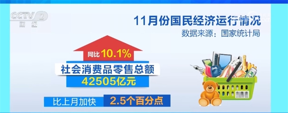 從消費看,出行類的商品銷售改善,服務(wù)消費潛力繼續(xù)釋放,市場銷售增勢良好。11月份社會消費品零售總額同比增長10.1%,比上月加快2.5個百分點,其中限額以上單位汽車類商品零售額增長14.7%,帶動作用明顯。