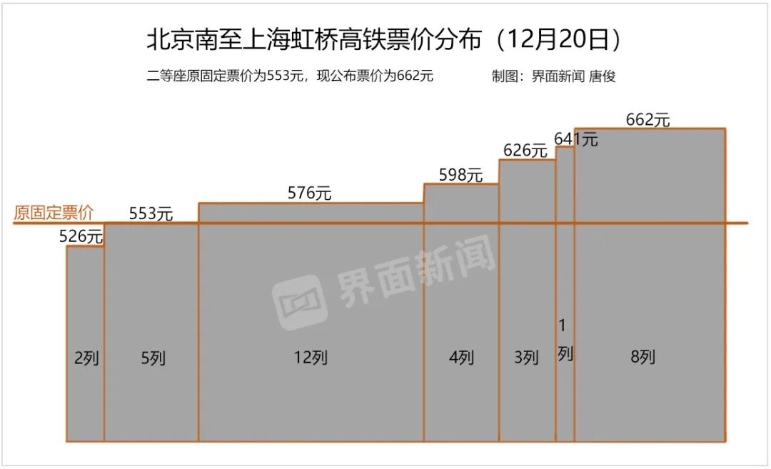 以京滬高鐵為例,此前全程二等座的固定票價為553元,現(xiàn)在的公布票價為662元。12月20日,北京南站至上海虹橋站開行35趟列車,其中只有2趟列車二等座票價低于553元,有5趟列車與原固定票價持平,其余80%列車高于原票價。漲價的列車中,8趟列車的實(shí)際票價與公布票價(662元)一致。