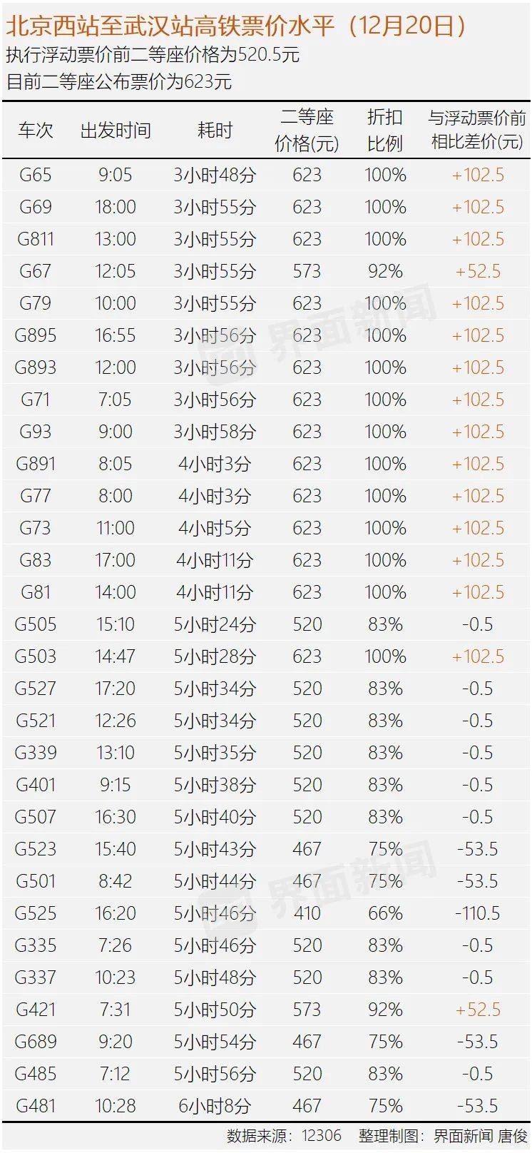 京廣高鐵北京西至武漢段去年6月份開始執(zhí)行浮動票價,在此之前二等座固定票價為520.5元,現(xiàn)在公布票價為623元。