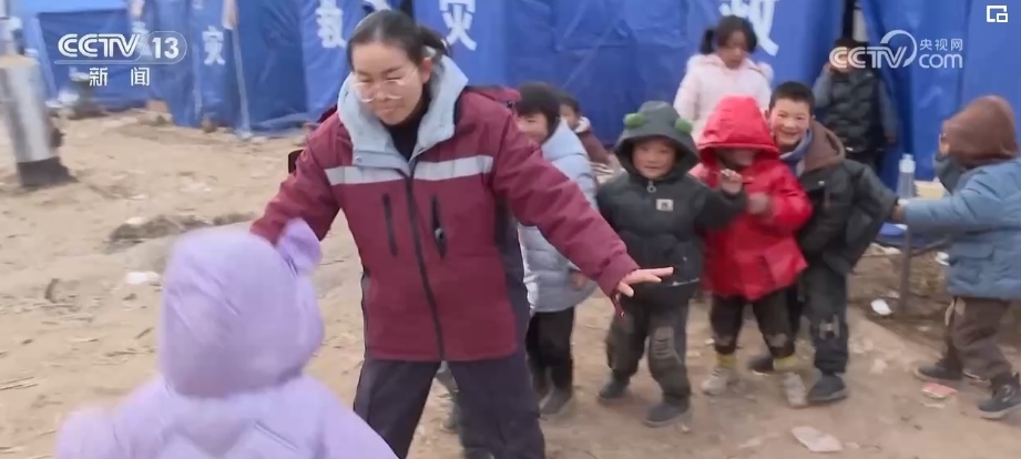 在康吊村三社的臨時(shí)安置點(diǎn),來(lái)自甘肅省第二人民醫(yī)院的心理治療師李轉(zhuǎn)雄正帶著村里的孩子做游戲。丟手絹、老鷹抓小雞,在一遍又一遍的追逐當(dāng)中,孩子們的笑聲越來(lái)越響亮。