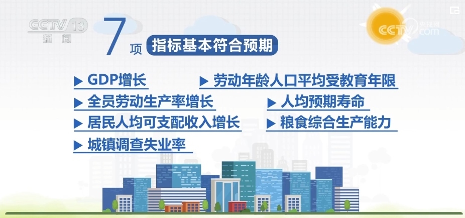 7項指標(biāo)基本符合預(yù)期,分別是GDP增長、全員勞動生產(chǎn)率增長、居民人均可支配收入增長、城鎮(zhèn)調(diào)查失業(yè)率、勞動年齡人口平均受教育年限、人均預(yù)期壽命、糧食綜合生產(chǎn)能力。