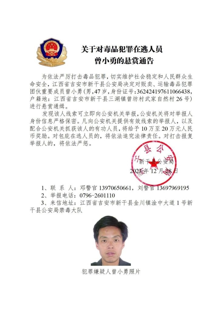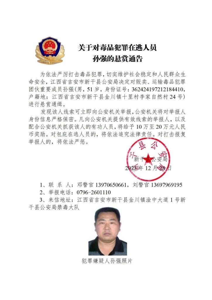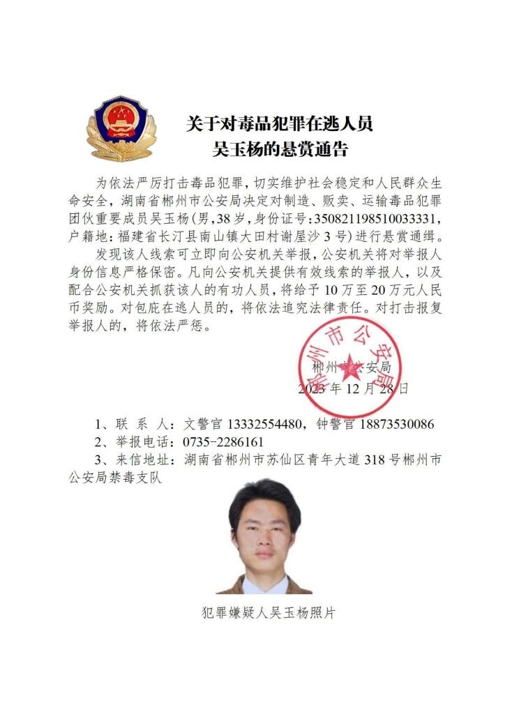 其中,湖南省郴州市公安局決定對(duì)張安龍、馬文祥、吳玉楊進(jìn)行公開(kāi)懸賞通緝;湖南省株洲市公安局決定對(duì)楊金梅進(jìn)行公開(kāi)懸賞通緝;江西省新干縣公安局決定對(duì)曾小勇、李國(guó)平、孫強(qiáng)進(jìn)行公開(kāi)懸賞通緝;浙江省溫州市公安局決定對(duì)顏歡平進(jìn)行公開(kāi)懸賞通緝;四川省遂寧市公安局決定對(duì)母朝東進(jìn)行公開(kāi)懸賞通緝;貴州省黔東南州公安局決定對(duì)龍華進(jìn)行公開(kāi)懸賞通緝。
