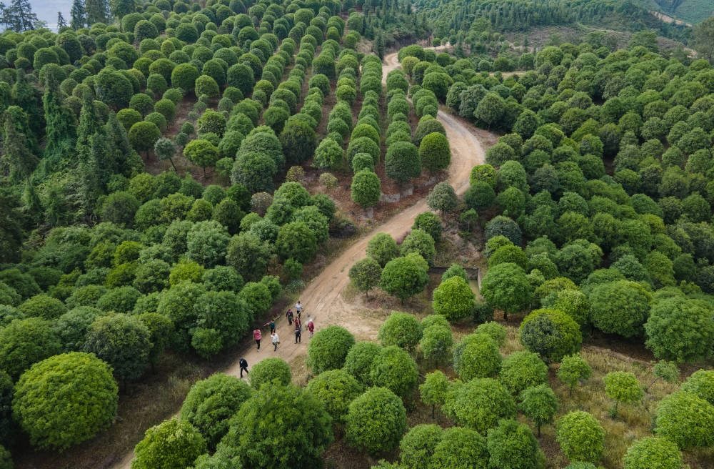 5月14日,李秀雄一家和工人走在四川省榮縣東興鎮(zhèn)長興林場(無人機(jī)照片)。25年來,李秀雄一家三代接力植樹造林,讓3000畝荒山變林海。